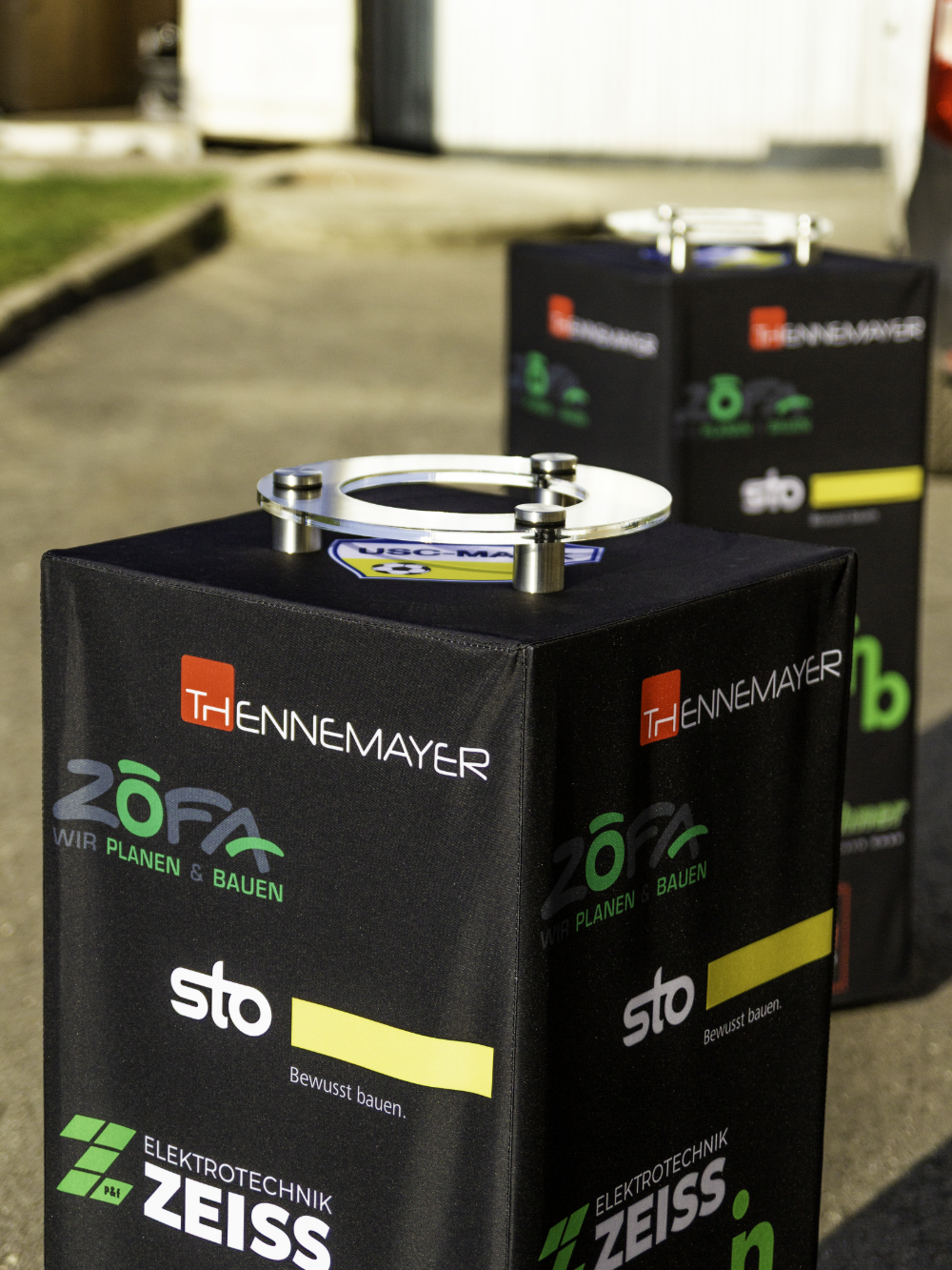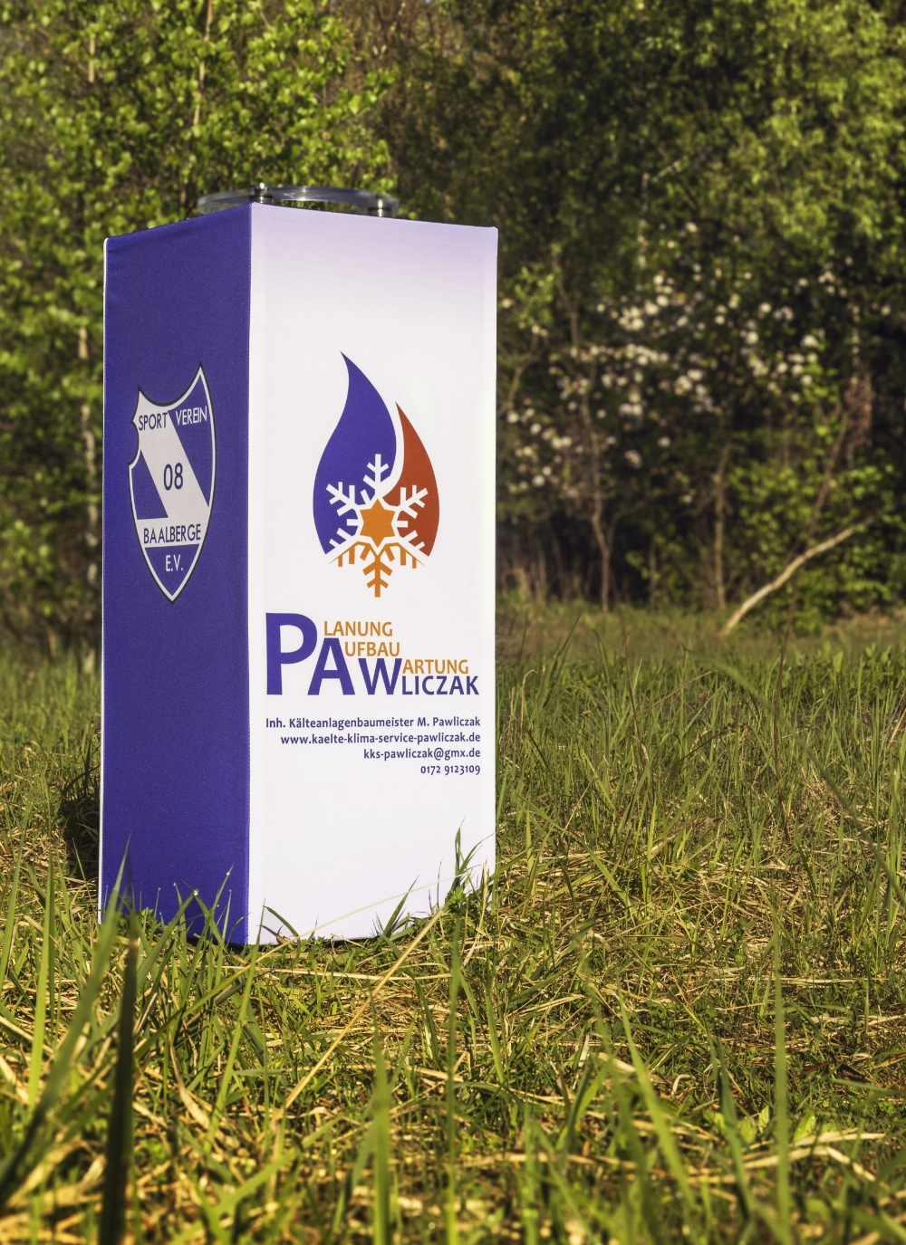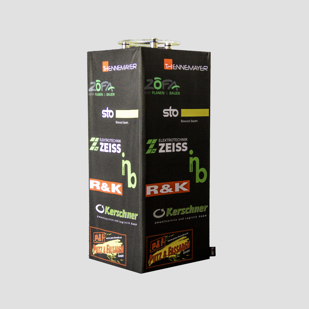 Der Ständer besteht aus einer leichten Aluminiumkonstruktion mit austauschbarem Textilbezug, den Sie rundum mit Ihrem Logo, Vereinsnamen oder Slogan gestalten können.
