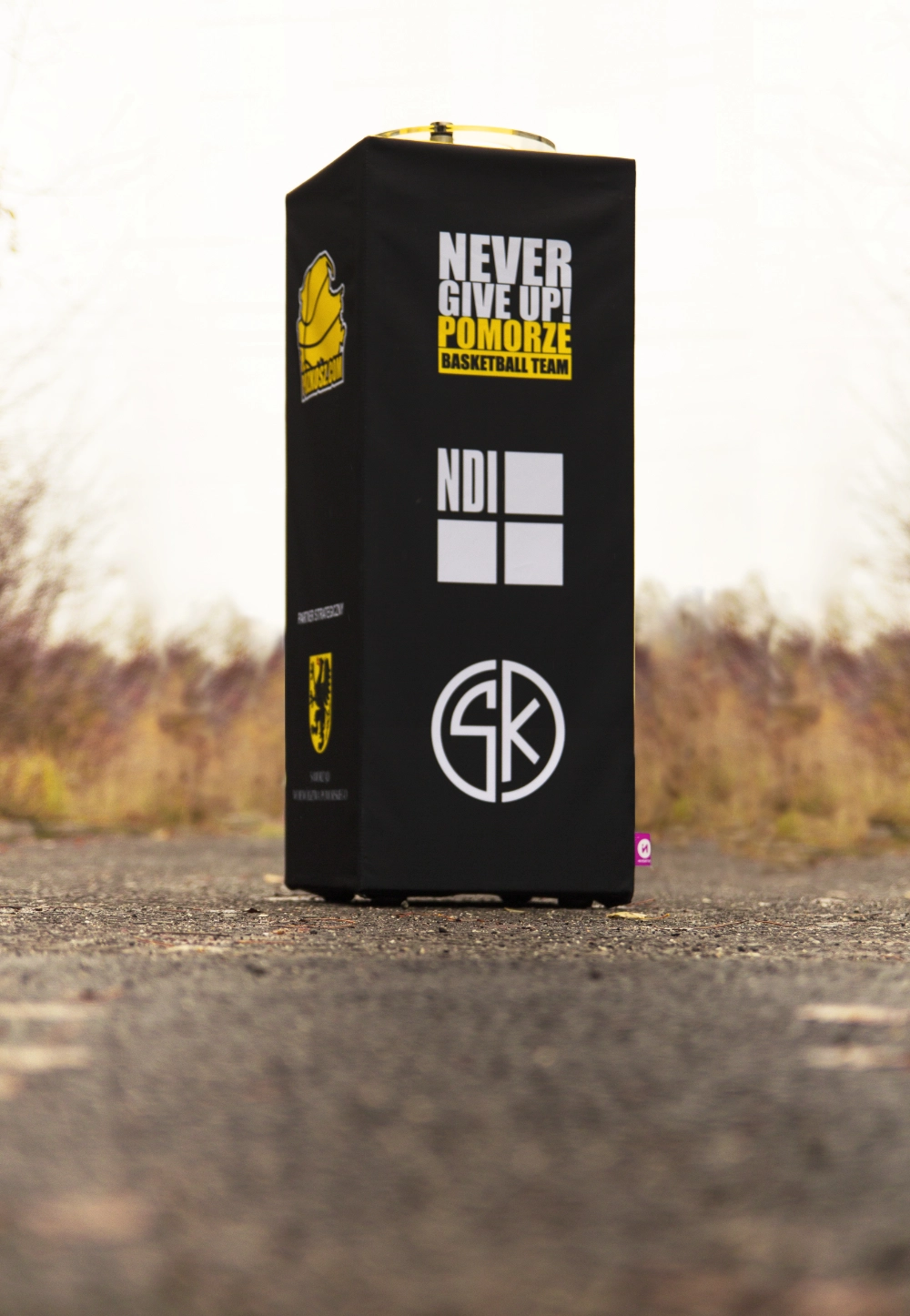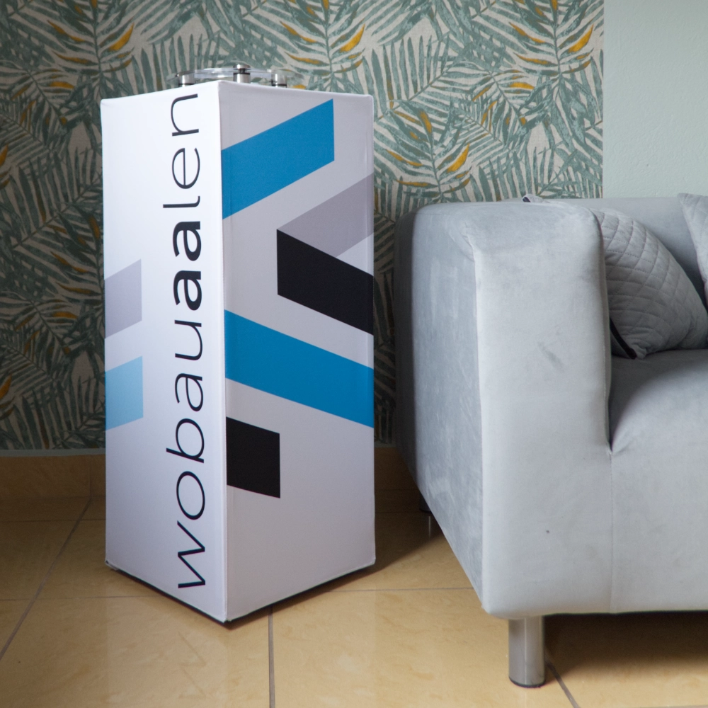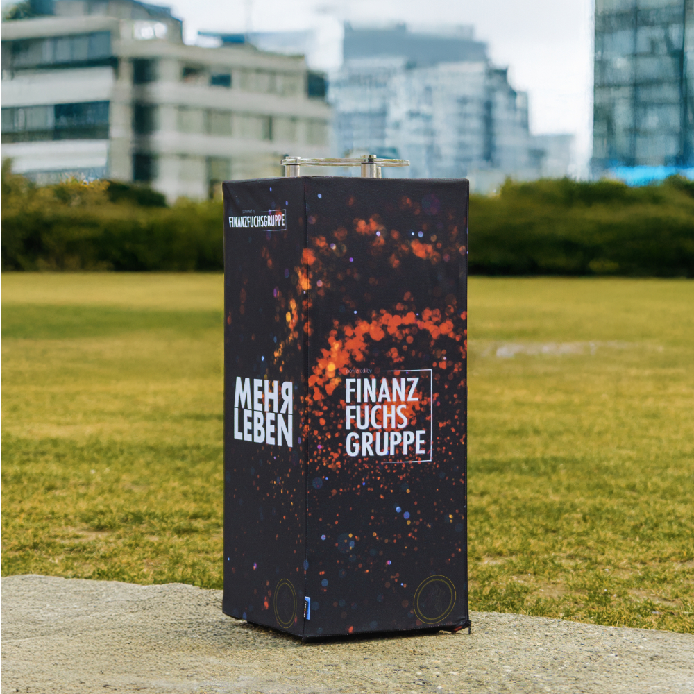 Der Ständer besteht aus einer leichten Aluminiumkonstruktion mit austauschbarem Textilbezug, den Sie rundum mit Ihrem Logo, Vereinsnamen oder Slogan gestalten können.